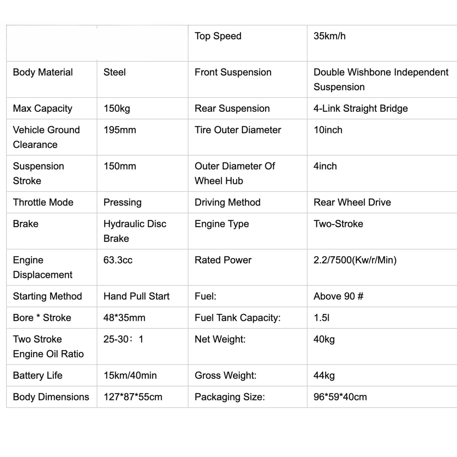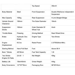 - Powerful Engine: 63cc gasoline engine delivers 2.4 kW of power for a safe yet exciting ride.